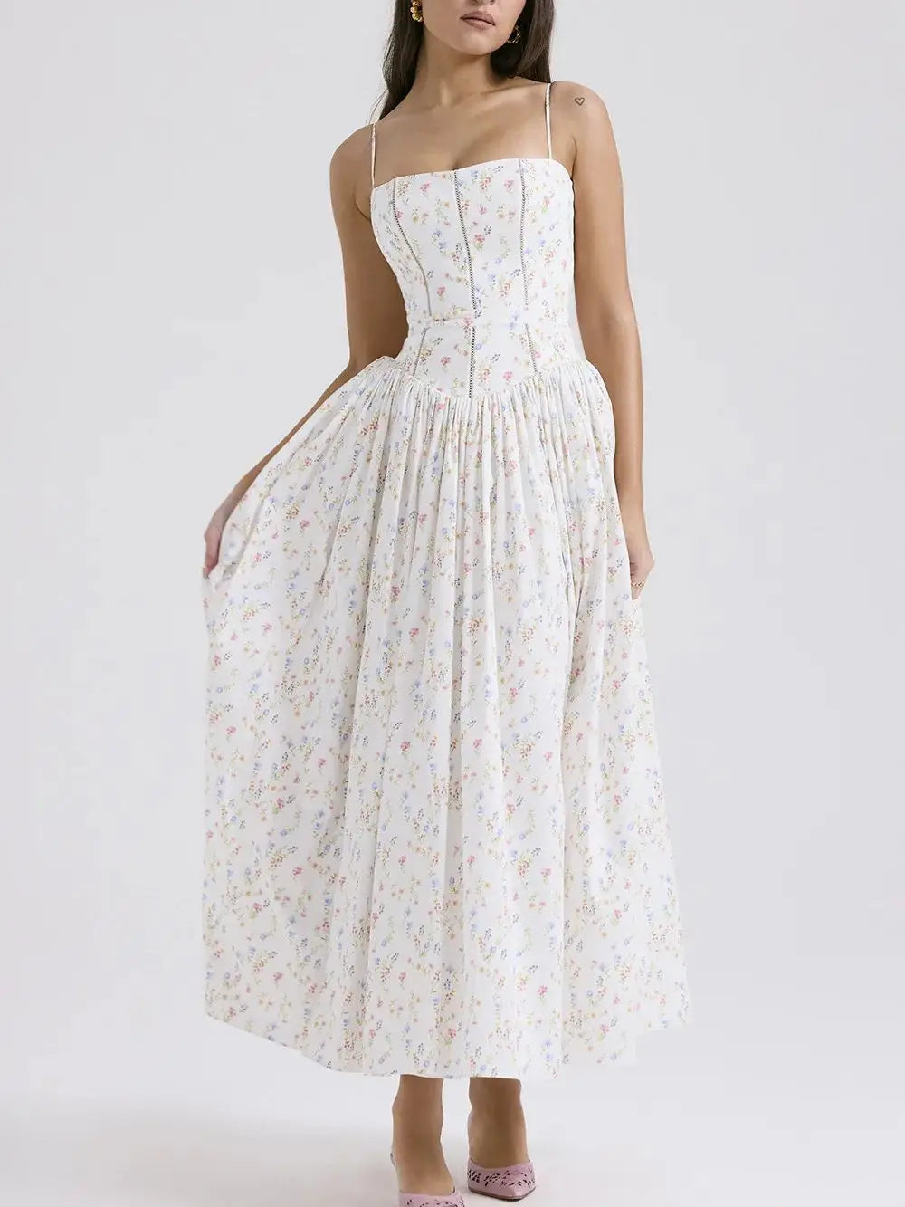 Maria is een elegante en romantische zomerjurk met een bloemenprint die doet denken aan tuinfeesten en zonnige dagen. Het is gemaakt van een katoenmix met een beetje stretch en heeft een nauwsluitende pasvorm aan de bovenkant die je decolleté mooi laat uitkomen. De dunne, verstelbare schouderbandjes zorgen voor een sierlijke en vrouwelijke silhouet.